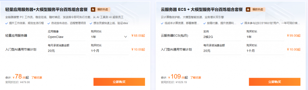- 云服务器 ECS + 大模型服务平台百炼组合套餐:109.00元起,云计算稳效护航,大模型智能加速,业务增长双引擎,低成本计算资源,部署推理服务按需付费,提升资源利用率。