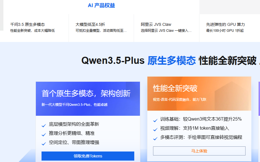 阿里云权益中心聚焦开发者与企业降本需求,整合AI与云产品双重优惠。AI权益涵盖千问3.5大模型4.5折、GPU算力优化、企业级AI开发平台PAI及精选AI组合购;云产品优惠包含新人限时抢购、场景化解决方案、“99”计划、免费试用及高校学生专属权益,搭配经济型e实例、通用算力型u1/u2i及轻量云服务器等特惠机型。平台通过多维度权益设计,助力个人、学生及企业用户快速上云,实现成本与效率的双重优化。