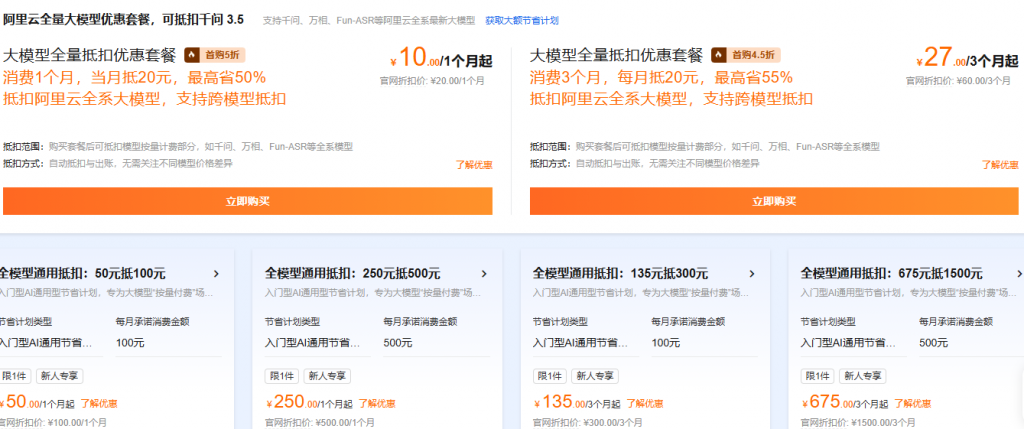 千问3.5原生多模态、架构创新、能力飞跃,入门套餐首购低至4.5折,可抵扣阿里云全量模型,包括千问、万相、Fun-ASR等全系最新大模型。具体优惠如下: