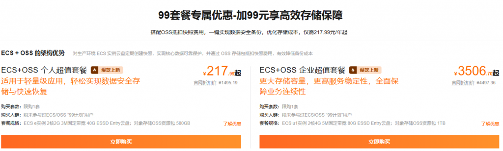 搭配OSS抵扣快照费用,一键实现数据安全备份,优化存储成本,仅需217.99元/年起。