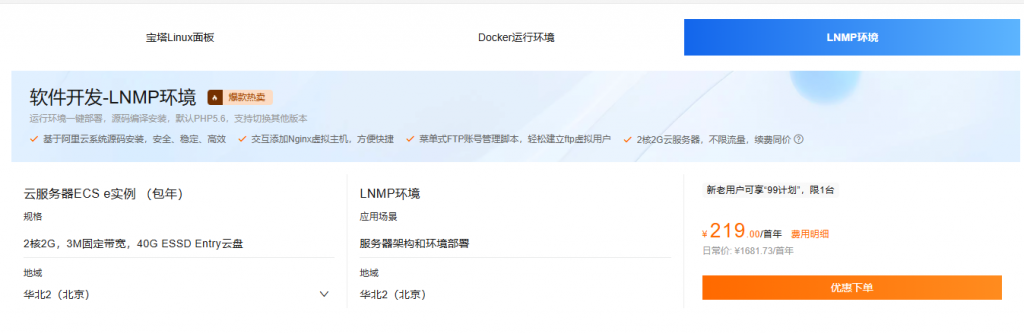- 包含云产品:云服务器ECS(2核2G,3M固定带宽,40G ESSD Entry云盘)+LNMP环境。
