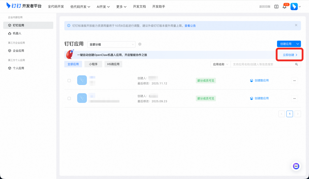 在开发者后台,在一键自动创建OpenClaw机器人处点击立即创建。