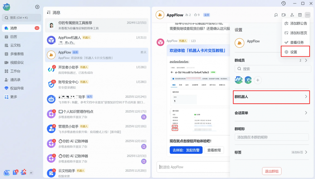可以创建群聊或在已有群聊中添加机器人,在飞书群中@机器人进行对话,或通过搜索的方式与机器人私聊进行测试。