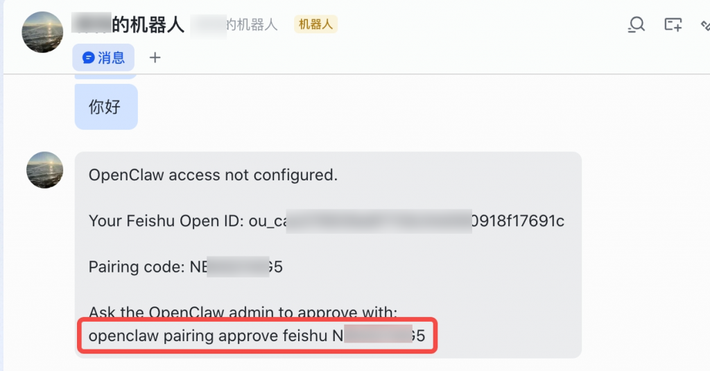 在WebUI页面输入openclaw pairing approve feishu 配对码完成配对。