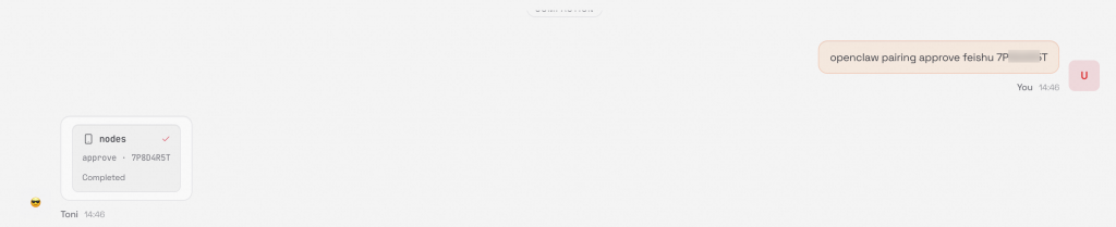 在终端执行以下命令,批准配对请求。将命令中的YXXX替换为上一步获取的实际配对码。openclaw pairing approve feishu YXXX