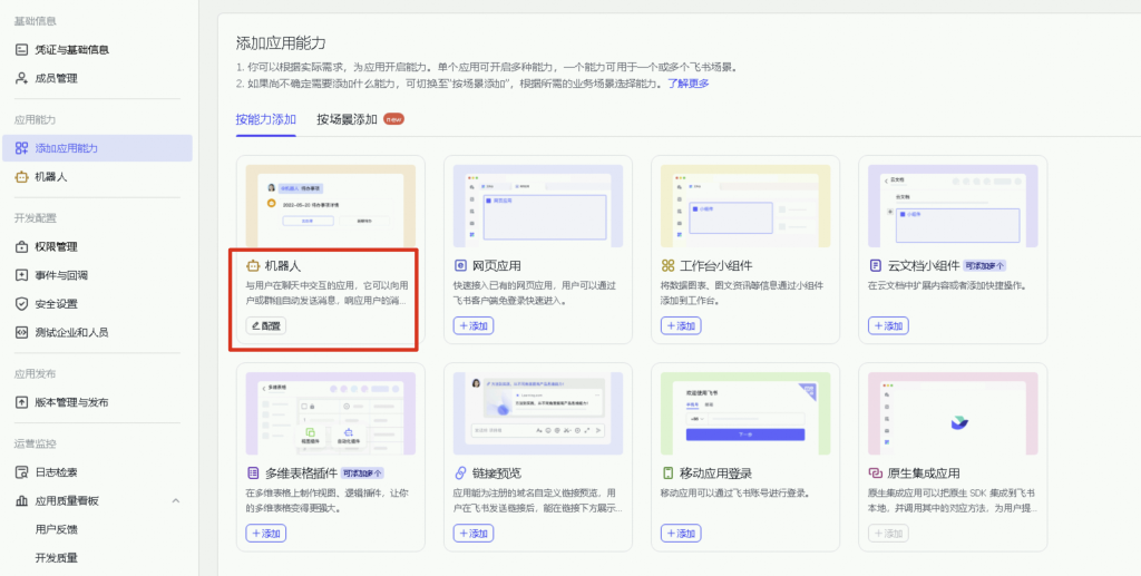 4.左侧导航栏中单击添加应用能力, 选择按能力添加页签,找到机器人卡片,单击配置。