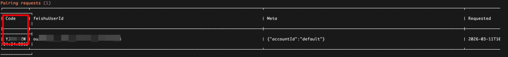 在终端执行以下命令,找到待配对的飞书机器人配对码,复制查询结果中的配对码。openclaw pairing list feishu