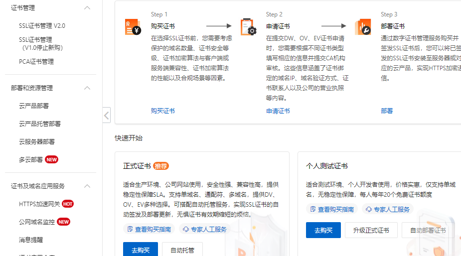 - 每个阿里云个人或企业用户(以实名认证为准),在每一个自然年内,可以通过以下购买步骤,免费获取最多20张个人测试证书。