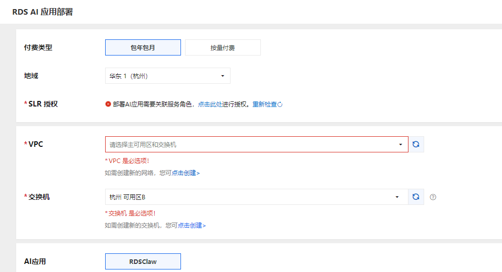 | 交换机 | 选择RDSClaw应用所在的交换机。如果当前VPC下没有可用的交换机,请单击前往创建。 |