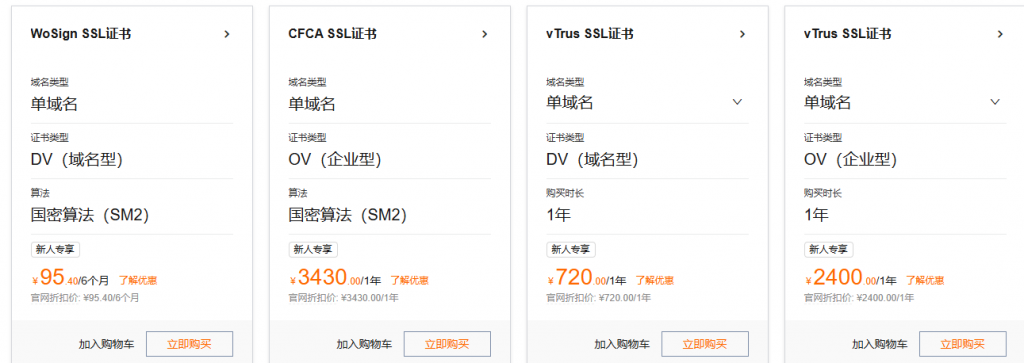 - vTrus SSL证书:单域名,证书类型 DV(域名型),活动价格 720.00/1年。