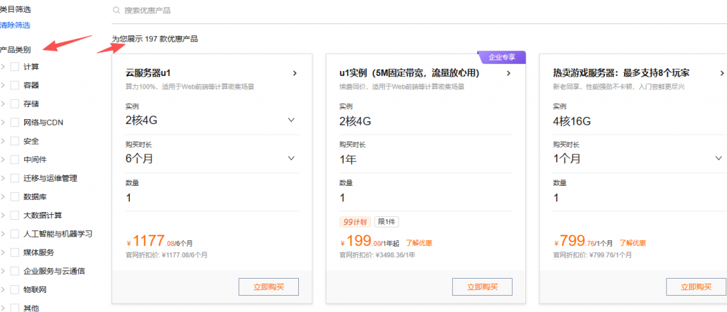 除了以上云产品之外,用户可筛选不同种类的云产品最新优惠信息,目前活动中心有197款优惠云产品,如下图所示: