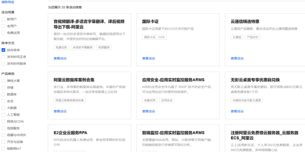 通过活动中心可根据活动场景(包括新用户、老用户、免费试用),排序方式(综合排序、发布时间正序、发布时间倒序),和产品类别,包括弹性计算、存储、数据库、安全、大数据、人工智能、网络与CDN、视频服务、容器与中间件、开发与运维、物联网IoT、混合云、企业服务与云通信等,快速查看自己想要的云产品目前有什么活动。如下图所示: