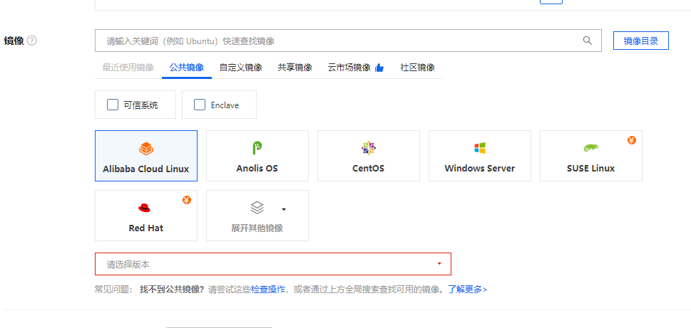 - 通过活动购买服务器的用户:需要注意的是,在参与阿里云的特惠活动购买服务器时,镜像选项通常只提供“公共镜像”和“云市场镜像”两类。
