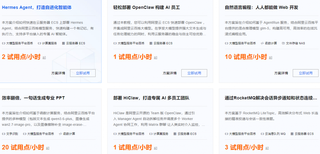 - Bolt.diy创意建站:通过CAP平台结合百炼模型服务实现实时代码生成,消耗5试用点/小时起,适用CAP、百炼、VPC、函数计算、ECS。