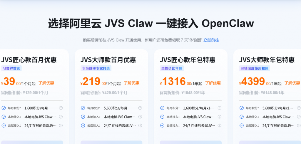 新用户专享权益:注册即领200积分,新用户可免费领取 7 天“体验版”,解锁JVS高效体验。套餐优惠持续放送,首月低至39元。活动详情可参考:https://www.aliyun.com/benefit/scene/openclaw