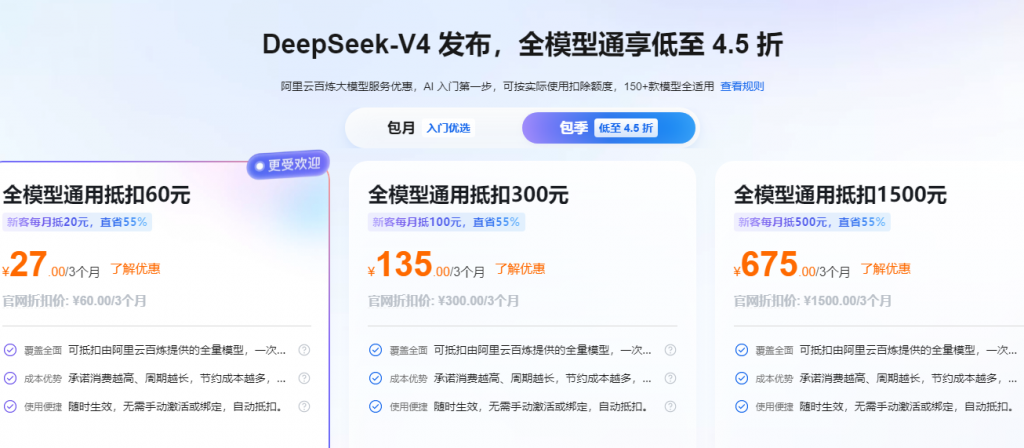 阿里云百炼现已正式上线DeepSeek-V4系列,首发DeepSeek-V4-pro与DeepSeek-V4-flash两款模型。平台提供全模型通享低至4.5折优惠,API定价与DeepSeek官网一致,百万Tokens输入仅需1元、输出仅需2元。该系列具备跨模型通用、自动抵扣等优势,并推出包月、包季等多档特惠套餐,承诺消费周期越长折扣越大。凭借高性价比与强劲性能,DeepSeek-V4系列可广泛赋能电商营销、广告创作、AI Coding及智能办公等场景,助力企业与开发者以低成本实现AI技术落地,加速业务创新。