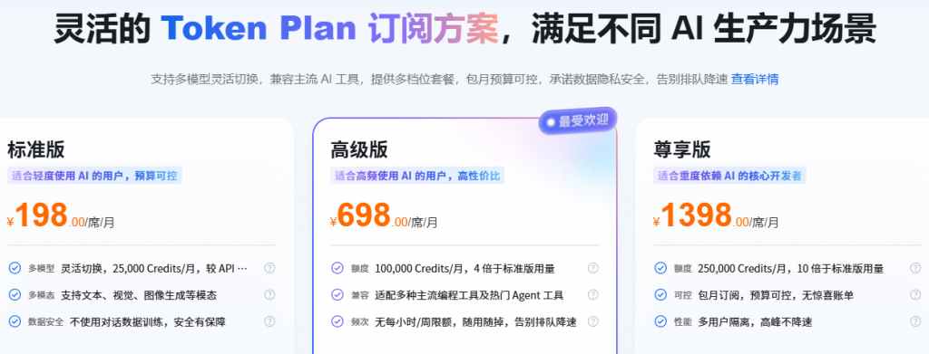 支持多模型灵活切换,兼容主流 AI 工具,提供多档位套餐,包月预算可控,承诺数据隐私安全,告别排队降速。