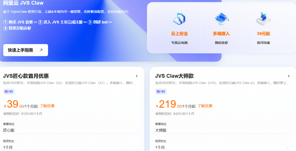 价格:9.00/1个月起,包含1600积分,本地电脑JVS Claw(x2),在线的云端JVS Claw (x1)。多端接入,随时掌上安全养虾。3折限量,每人限购1次。 - JVS Claw大师款