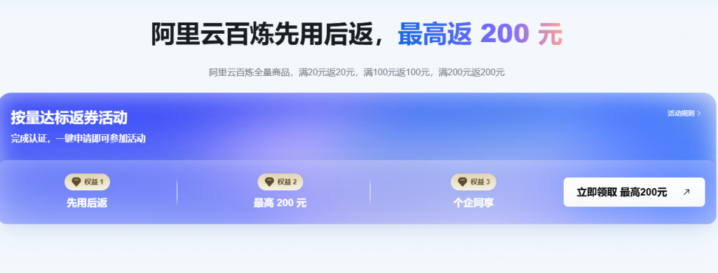 阿里云百炼先用后返,个企同享,最高返 200 元,阿里云百炼全量商品,满20元返20元,满100元返100元,满200元返200元。