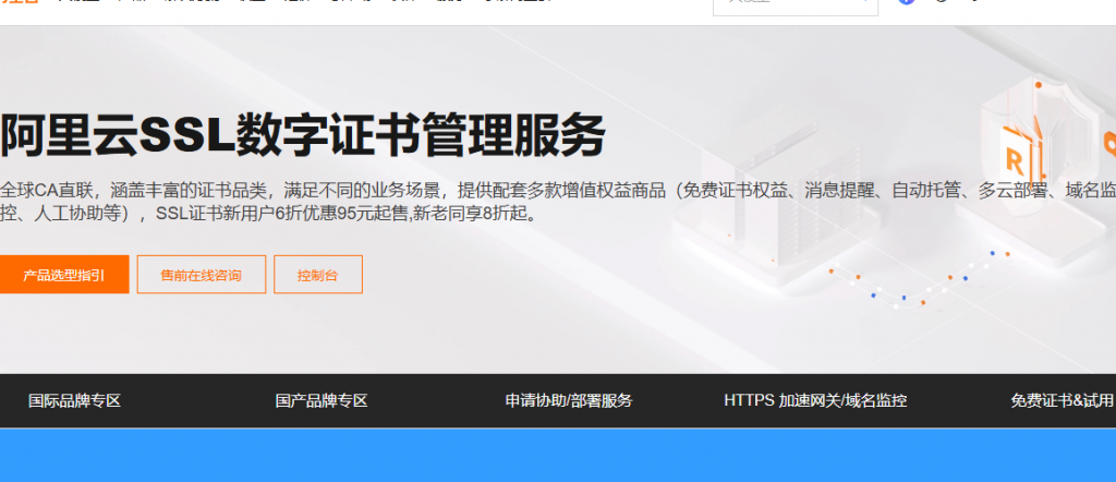 1.登录数字证书管理服务:https://www.aliyun.com/product/cas,并进入数字证书管理服务控制台。