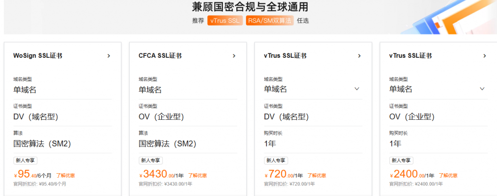 - CFCA SSL证书:单域名,OV(企业型),国密算法(SM2),活动价格3430.00元/1年;