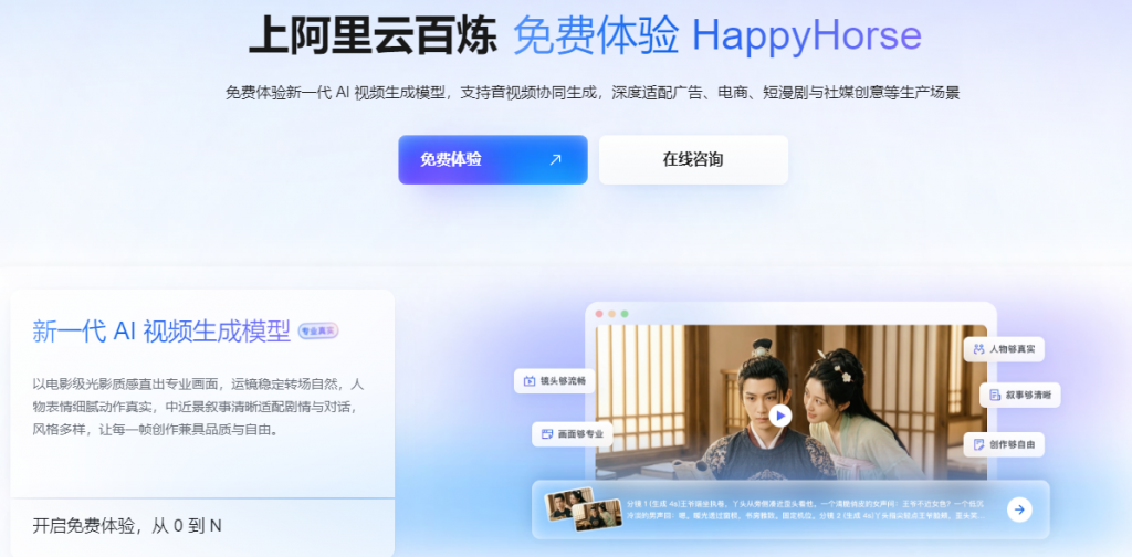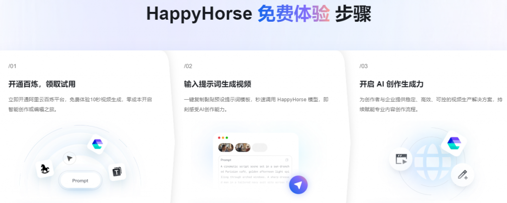 目前用户可免费体验HappyHorse,申请入口为:https://www.aliyun.com/benefit/scene/happyhorse