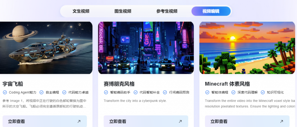 - 功能:对现有视频进行风格转换、局部替换等编辑,支持结合参考图和文本指令(如“将视频风格改为水墨画”)。