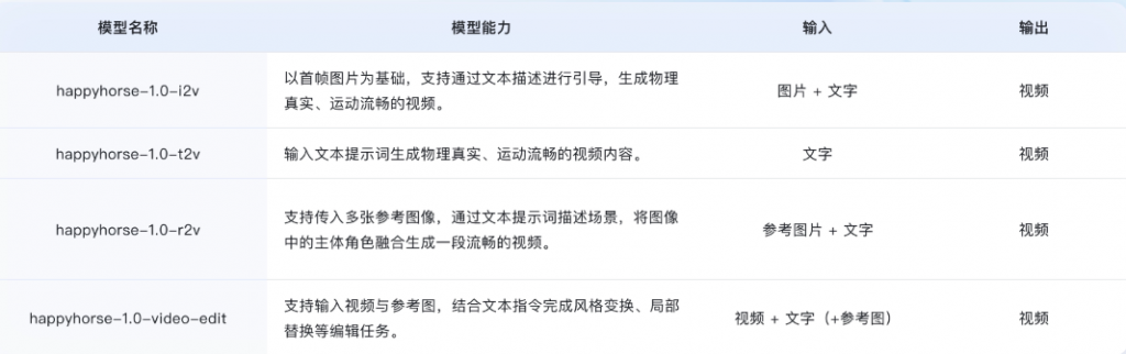| happyhorse-1.0-i2v | 以首帧图片为基础,支持通过文本描述进行引导,生成物理真实、运动流畅的视频。 | 图片+文字 | 视频 |