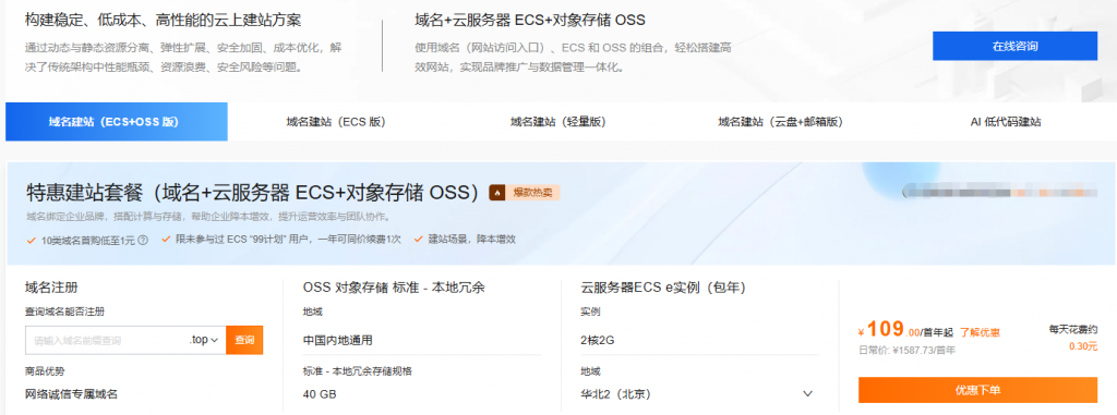 - 特惠建站套餐(域名+云服务器 ECS+对象存储 OSS):109.00元/首年起;
