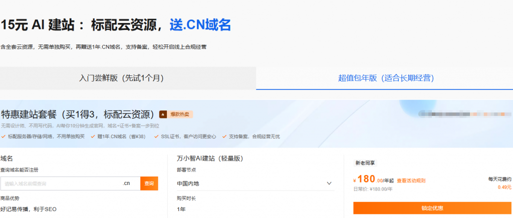 二、15元 AI 建站 :标配云资源,送.CN域名