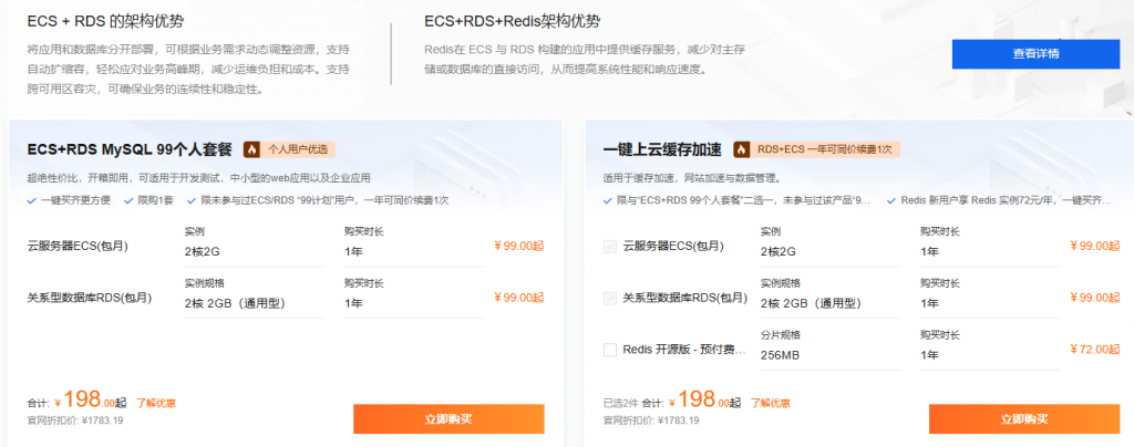 - ECS+RDS MySQL 99个人套餐:198.00元起;