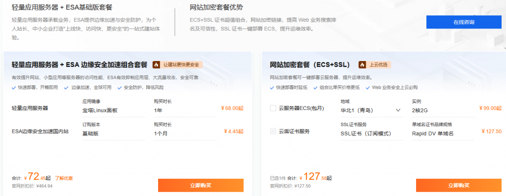 - 网站加密套餐(ECS+SSL):127.50元起;