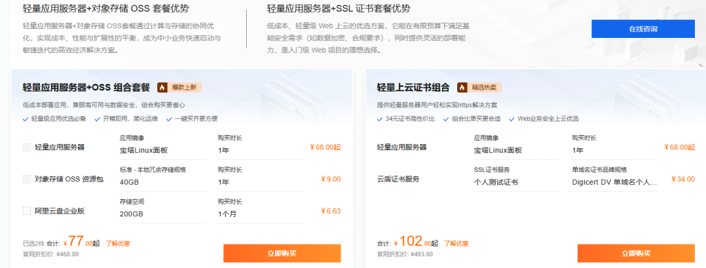 - 轻量应用服务器+OSS 组合套餐:77.00元起;